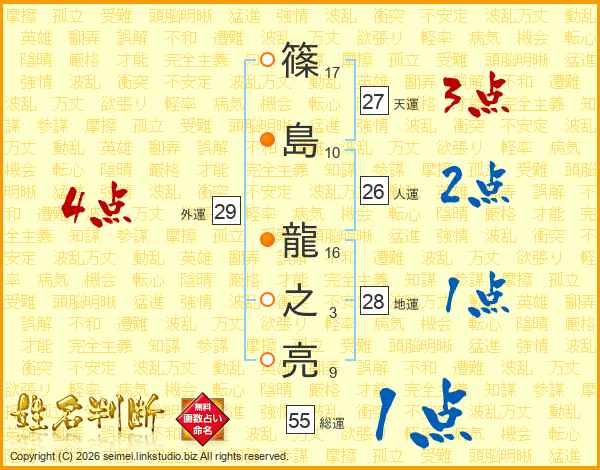 篠(17画)島(10画) 龍(16画)之(3画)亮(9画)