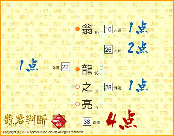 翁(10画) 龍(16画)之(3画)亮(9画)