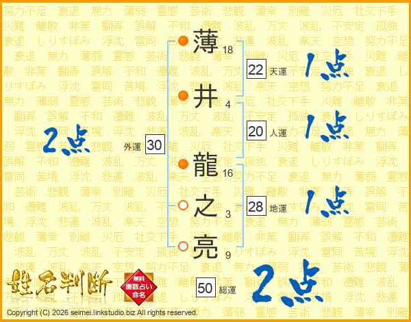 薄(18画)井(4画) 龍(16画)之(3画)亮(9画)