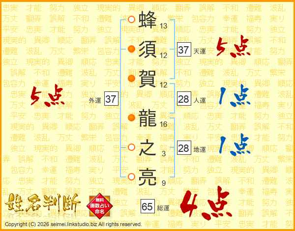 蜂須賀龍之亮さんの天運は37画の5点!