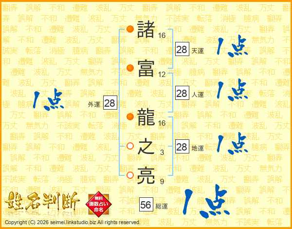 諸(16画)富(12画) 龍(16画)之(3画)亮(9画)
