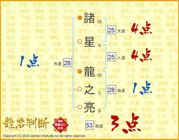 諸(16画)星(9画) 龍(16画)之(3画)亮(9画)