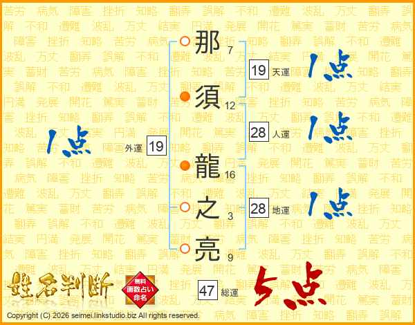 那(7画)須(12画) 龍(16画)之(3画)亮(9画)