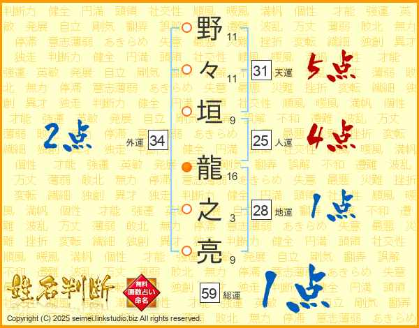 野(11画)々(11画)垣(9画) 龍(16画)之(3画)亮(9画)