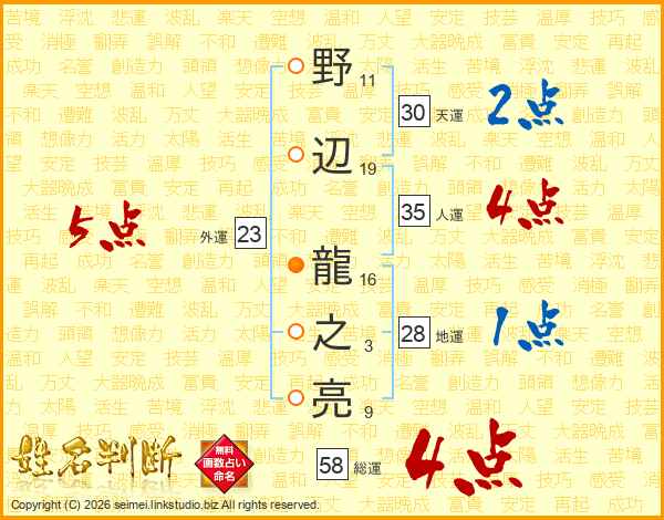 野(11画)辺(19画) 龍(16画)之(3画)亮(9画)