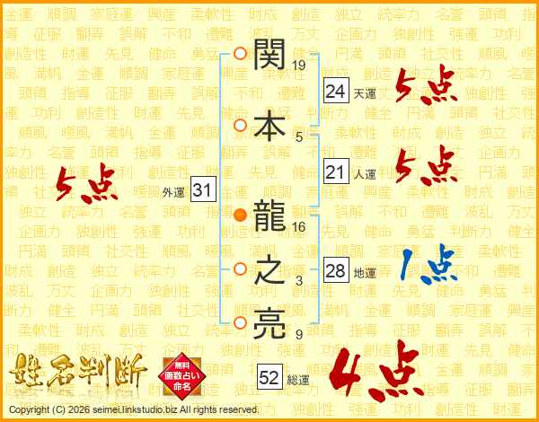 関本龍之亮さんの総運は52画の4点!