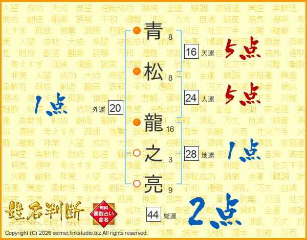 青(8画)松(8画) 龍(16画)之(3画)亮(9画)