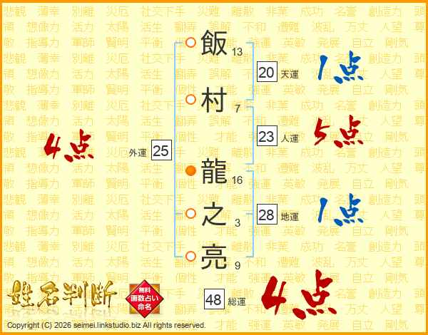 飯村龍之亮さんの総運は48画の4点!