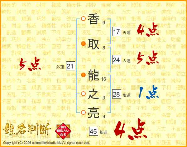 香(9画)取(8画) 龍(16画)之(3画)亮(9画)