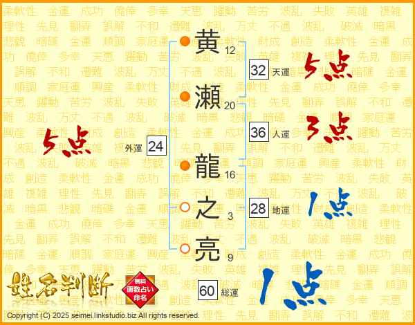 黄(12画)瀬(20画) 龍(16画)之(3画)亮(9画)