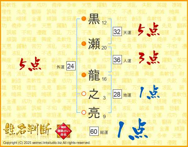 黒(12画)瀬(20画) 龍(16画)之(3画)亮(9画)
