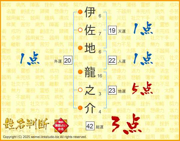 伊(6画)佐(7画)地(6画) 龍(16画)之(3画)介(4画)