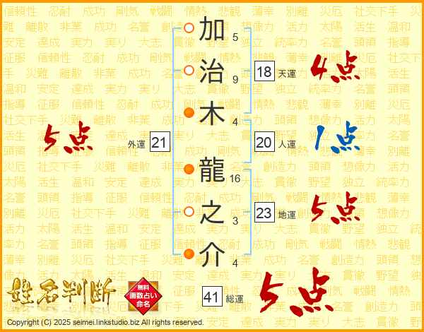 加(5画)治(9画)木(4画) 龍(16画)之(3画)介(4画)