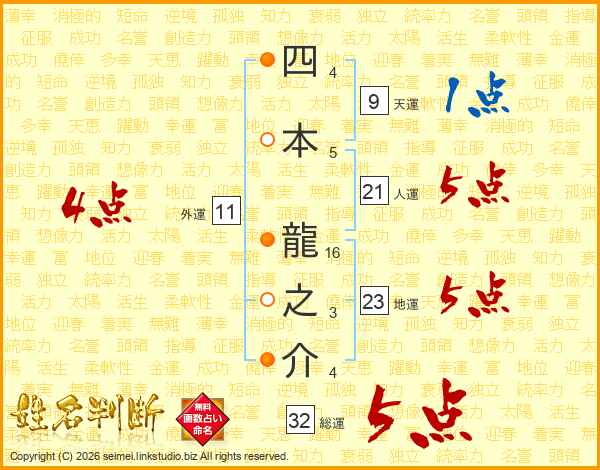 四本龍之介さんの総運は32画の5点!