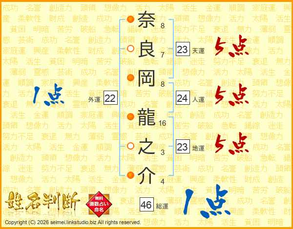奈(8画)良(7画)岡(8画) 龍(16画)之(3画)介(4画)