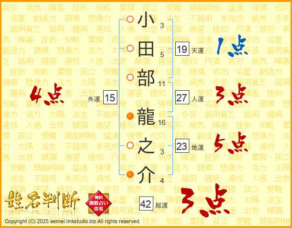 小田部龍之介さんの総運は42画の3点!