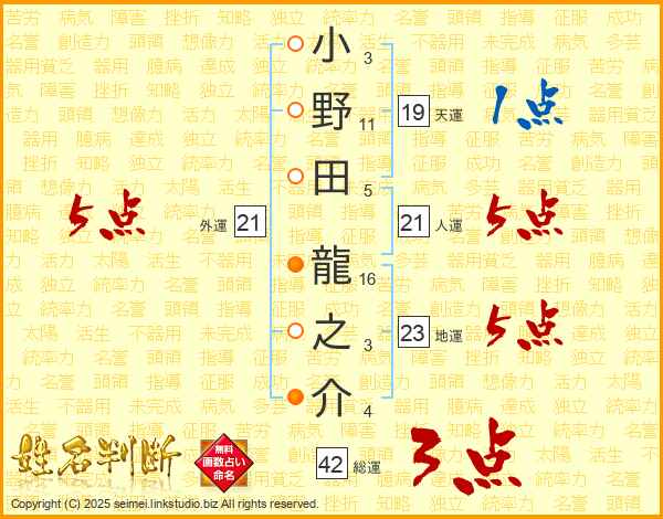 小(3画)野(11画)田(5画) 龍(16画)之(3画)介(4画)