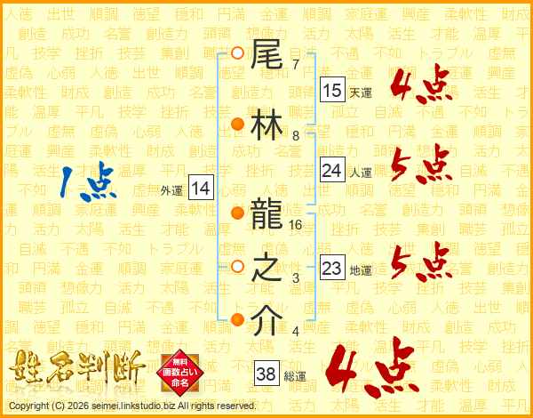 尾林龍之介さんの総運は38画の4点!