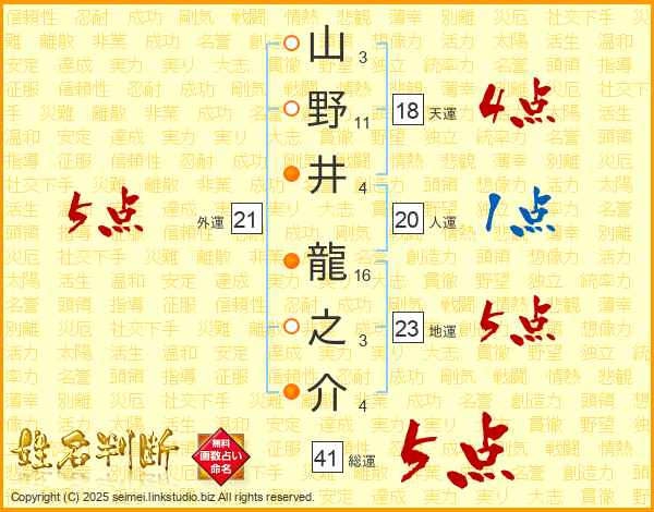 山野井龍之介さんの総運は41画の5点!