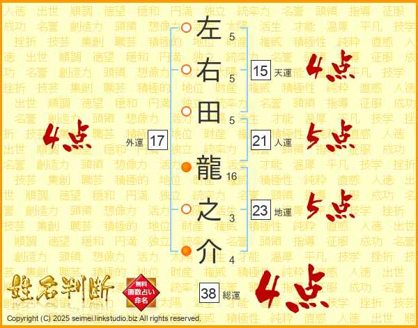 左(5画)右(5画)田(5画) 龍(16画)之(3画)介(4画)