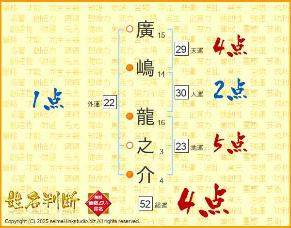 廣嶋龍之介さんの総運は52画の4点!