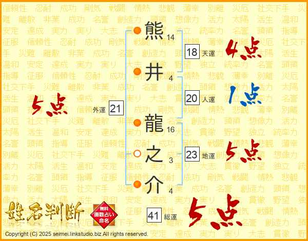 熊井龍之介さんの総運は41画の5点!