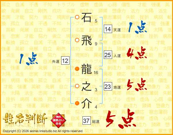 石(5画)飛(9画) 龍(16画)之(3画)介(4画)