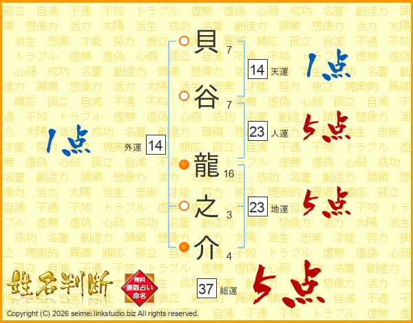 貝谷龍之介さんの総運は37画の5点!