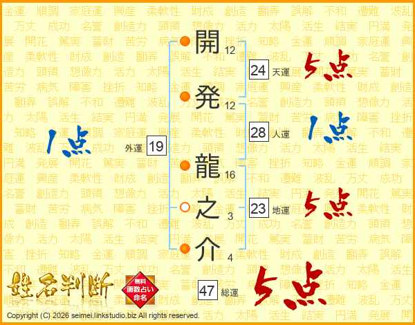 開発龍之介さんの総運は47画の5点!