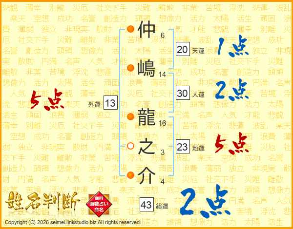 仲(6画)嶋(14画) 龍(16画)之(3画)介(4画)