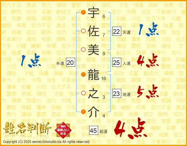 宇(6画)佐(7画)美(9画) 龍(16画)之(3画)介(4画)