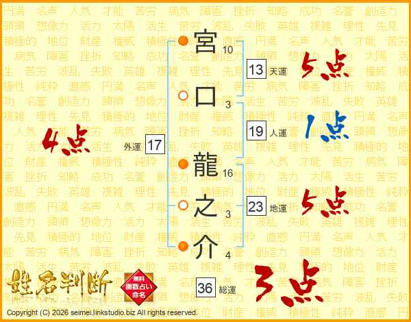 宮口龍之介さんの天運は13画の5点!
