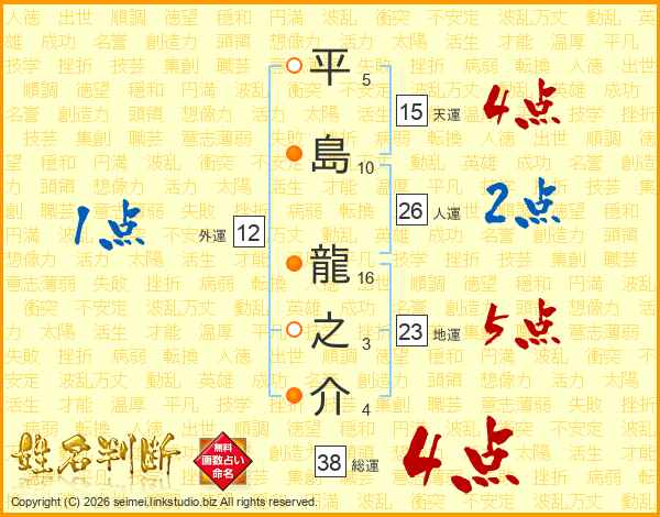 平(5画)島(10画) 龍(16画)之(3画)介(4画)