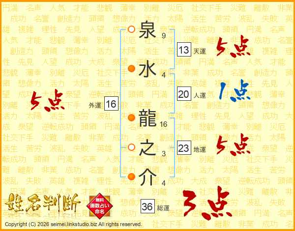 泉水龍之介さんの外運は16画の5点!