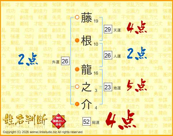 藤根龍之介さんの総運は52画の4点!