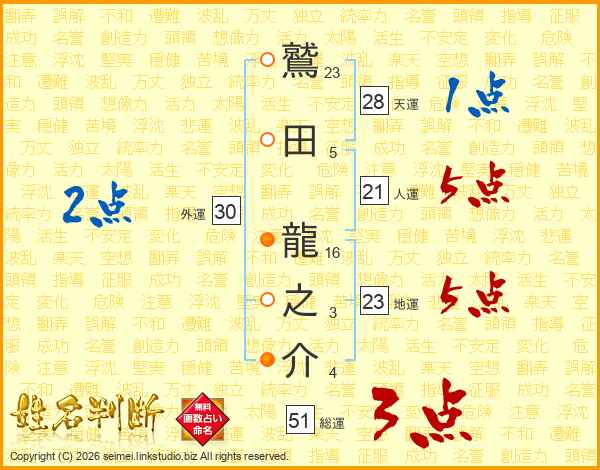 鷲(23画)田(5画) 龍(16画)之(3画)介(4画)