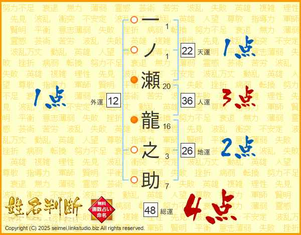 一(1画)ノ(1画)瀬(20画) 龍(16画)之(3画)助(7画)