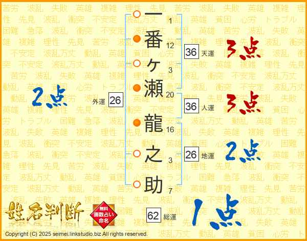 一番ヶ瀬龍之助さんの地運は26画の2点!