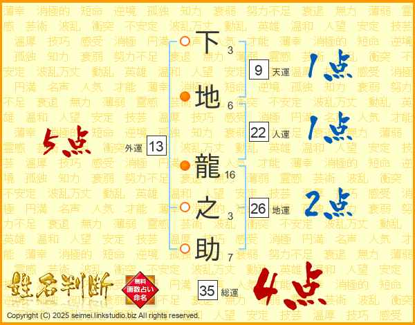 下(3画)地(6画) 龍(16画)之(3画)助(7画)