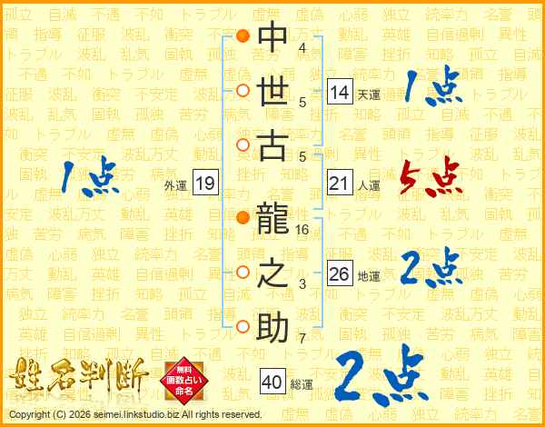 中(4画)世(5画)古(5画) 龍(16画)之(3画)助(7画)
