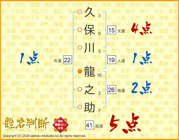 久保川龍之助さんの総運は41画の5点!
