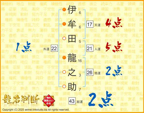 伊(6画)牟(6画)田(5画) 龍(16画)之(3画)助(7画)