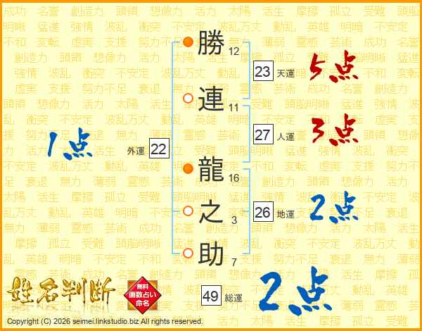 勝(12画)連(11画) 龍(16画)之(3画)助(7画)