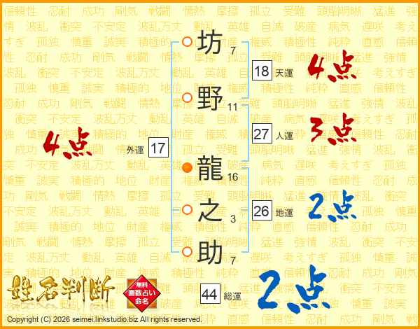 坊(7画)野(11画) 龍(16画)之(3画)助(7画)