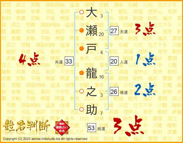 大(3画)瀬(20画)戸(4画) 龍(16画)之(3画)助(7画)