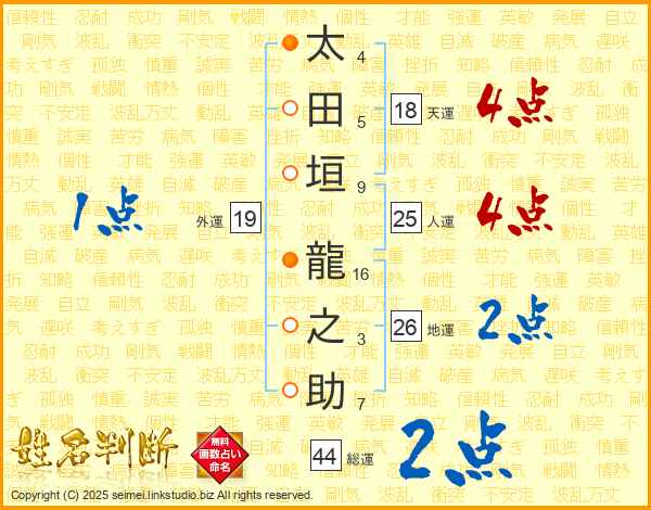 太(4画)田(5画)垣(9画) 龍(16画)之(3画)助(7画)