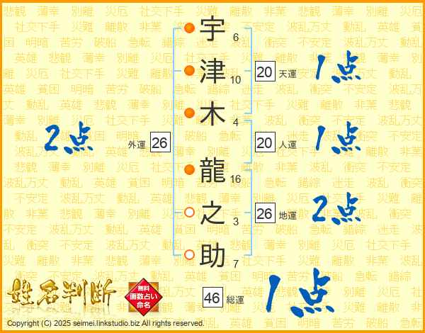 宇(6画)津(10画)木(4画) 龍(16画)之(3画)助(7画)