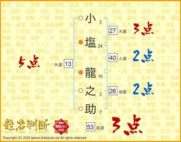 小(3画)塩(24画) 龍(16画)之(3画)助(7画)