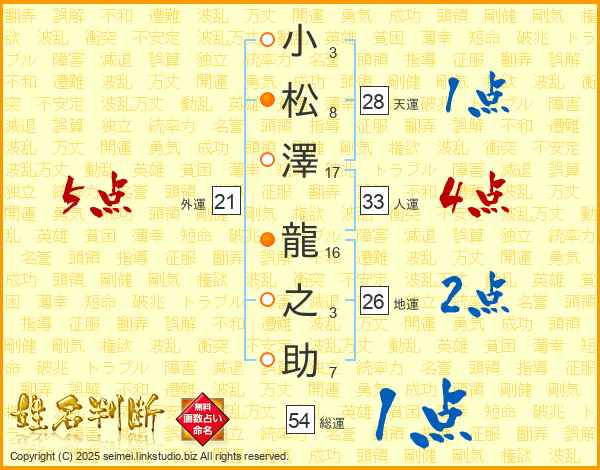 小(3画)松(8画)澤(17画) 龍(16画)之(3画)助(7画)