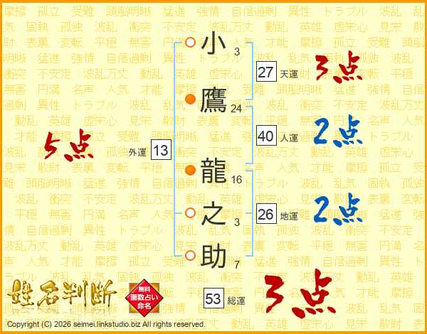 小(3画)鷹(24画) 龍(16画)之(3画)助(7画)